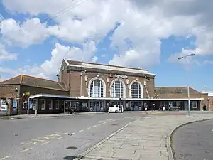 Ramsgate railway station is a 1920s brick-built station thought to have been designed by James Robb Scott and Edwin Maxwell Fry, and built between 1924 and 1926. Margate station and the demolished Dumpton Park station are of a similar design. The building is Grade II listed.[2]