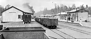 Surveying for the route between Hīhītahi and Piriaka began in 1894.[5] Bush felling for the railway started in 1900.[6] The rails were extended to the station on 31 May 1907[6] and a passenger train with dignitaries and reporters reached it in July.[7] The line opened from Waiouru to Rangataua for goods traffic on 12 August 1907. A stationmaster was appointed in August 1907. There was mention of cars for passenger trains from Mataroa to Rangataua in September 1907.[6]