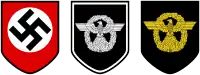 In addition to collar and shoulder insignia, Ordnungspolizei also wore the wreathed police eagle on the upper left sleeve. The collar patch and shoulderboards were backed, and the sleeve eagle (below the rank of Leutnant) embroidered, in truppenfarbe, a color-code which indicated the branch of police: green for Schutzpolizei (protection police) and police general officers, wine-red for Gemeindepolizei (municipal protection police), orange for rural Gendarmerie, carmine-red for fire brigades, gold for maritime police, light grey for administrative police.[1]