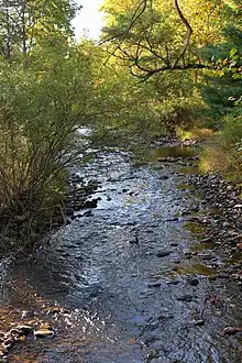 The upper reaches of Rapid Run and its tributary Halfway Run were prehistorically the headwaters of Elk Creek, which is now located 3 miles (4.8 km) to the west of R.B. Winter State Park and drains the western part of Brush Valley. However, in the distant past, a right-angle tributary of Rapid Run (which at the time was confined to the Fourteenmile Narrows) cut its way back from near Seven Notch Mountain and "beheaded" the upper reaches of Elk Creek, causing the headwaters of Elk Creek to flow into Rapid Run.[8] The capture of the headwaters of Elk Creek by Rapid Run occurred approximately one million years ago and has been described as a "blatant act of 'stream piracy'".[8] Aggradation at the mouth of the stream once partly dammed Buffalo Creek, resulting in as much as 98 feet (30 m) of fill.[10]