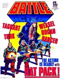 As a result of Ezquerra's commitments numerous artists filled in on the strip, including Massimo Belardinelli, while the format of standalone six-page stories saw several writers rotate on the strip.[2] It nevertheless a hit with readers.[1] "Rat Pack" appeared in the first issue of Battle in March 1975 and initially ran until January 1976,[3] but would return periodically due to reader demand.[4] Alan Hebden would eventually become the main writer. He remembered he felt there were too many characters, and frequently pitched killing off Rogan as he "was the deserter and nobody ever liked that".[5]