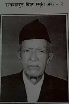 Ratna Bahadur Bista (1910–1990) was the fifth Chief Justice of Nepal. He was born in Dadeldhura to an aristocratic family that was given land grants in Sudurpashchim Province circa 1911 during a hunting trip by King George V of the United Kingdom and Chandra Shumsher Jang Bahadur Rana, the Prime Minister of the Rana Dynasty.[1] He went on to become the 5th Chief Justice of Nepal, in office from 26 July 1970 to 6 August 1976.[2][3][4] He was appointed by the then-king of Nepal, Mahendra. He was responsible for the Summary Procedure Act 1971. The Committee that he established recommended for the establishment of High Courts in different regions which resulted in the creation of a four tiered judicial structure with one additional tier in the middle- "the Regional Courts."[3]