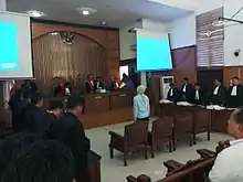Soon afterwards, she admitted that her claims were lies, and that she made up the assault story to hide the plastic surgery from her family. She was also quoted as saying that she is "the best hoax creator".[35] She was then fired from Prabowo Subianto's 2019 election campaign team, with Prabowo publicly apologizing for amplifying her claims.[36][37] On 4 October 2018 she was apprehended at Soekarno-Hatta International Airport, where she was about to fly to Chile to attend an international conference, with Jakarta's Tourism Agency funding her.[38][39] She is suspected of violating Article 28 of the Electronic Information and Transactions Law for allegedly spreading fake news.[40] According to police, Ratna paid for the plastic surgery from the same bank account that had been used to collect money for the victims of the June 2018 Lake Toba ferry disaster.[41] State prosecutors in May 2019 recommended she be jailed for six years.[42] On 11 July 2019, she was sentenced to two years in jail for deliberately spreading false information with the intention of creating a public disturbance.[4] After receiving sentence remissions in connection with Indonesian Independence Day and the Muslim holiday of Idul Fitri, she was granted parole and released on 26 December 2019, having served almost 15 months of her 2-year sentence. After leaving jail, she claimed she had been punished for "criticizing the government" and said her criticism was merely an expression of love for the country. [43]