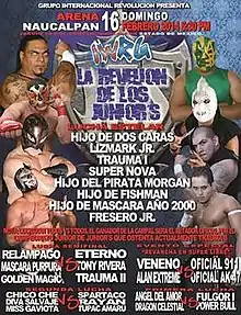 Professional wrestling has been a generational tradition in Lucha libre since its inception early in the 20th century, with a great deal of second or third-generation wrestlers following in the footsteps of their fathers or mothers.[3] Several lucha libre promotions honor those traditions, often with annual tournaments such as Consejo Mundial de Lucha Libre's La Copa Junior.[4] The Naucalpan, State of Mexico based International Wrestling Revolution Group (IWRG) created the IWRG Junior de Juniors Championship in 2011, a championship where only second or third-generation wrestlers are allowed to challenge for it. In addition to legitimate second-generation wrestlers there are a number of wrestlers who are presented as second or third-generation wrestlers, normally masked wrestlers promoted as "Juniors". These wrestlers normally pay a royalty or fee for the use of the name, using the name of an established star to get attention from fans and promoters.[3] Examples of such instances of fictional family relationships include Arturo Beristain, also known as El Hijo del Gladiador ("The Son of El Gladiador") who was not related to the original El Gladiador, or El Hijo de Cien Caras who paid Cien Caras for the rights to use the name.[5][6] Weeks after the creation of the Junior de Juniors Championship IWRG held their first IWRG Rebelión de los Juniors show with the centerpiece of the show being the Junior de Juniors Championship. The Rebelión de los Juniors shows, as well as the majority of the IWRG shows in general, are held in "Arena Naucalpan", owned by the promoters of IWRG and their main arena. The 2014 show was the fourth year in a row that IWRG used the Rebelión de los Juniors name for a show