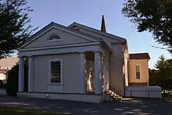 Red Clay Creek Presbyterian Church, also known as McKennan's Church, is a historic Presbyterian church located at Mill Creek and McKennan's Church Roads near Newark, New Castle County, Delaware. It was built in 1853, and is a two-story, stuccoed stone structure. It was originally rectangular in plan, but additions have given it an irregular cruciform shape. It features a colonnaded porch in the Greek Revival style with a fanlight and an enclosed vestibule. The south wall incorporates a date stone from the original church building, marked "WM 1761".[2]