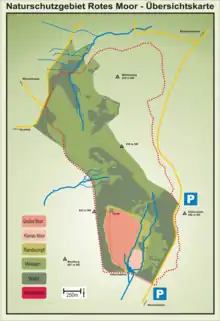 The Red Moor is the largest raised bog in Hesse, followed by the moor in the Breungeshain Heath (4 ha) on the uplands of the Vogelsberg.[2] In the Rhön it is the second largest bog after the Black Moor; others being the Great Moor (Großes Moor, 8 ha) and Little Moor (Kleines Moor, 2 ha) on the Stirnberg, and the Moorlein on the Rasenberg.[3] As a result of centuries of peat extraction, which lasted until the 1980s, only an area of about five hectares is left as a core zone. The Red Moor is divided into two areas: The Great Red Moor (Großes Rotes Moor, formerly 32 hectares of raised bog – today just under 11 ha) and the Little Red Moor (Kleines Rotes Moor, formerly 7 hectares of raised bog – today 1.7 ha).[4] It lies about five kilometres southeast of the Wasserkuppe on the B 278 federal highway between the village of Ehrenberg (part of Wüstensachsen) on the Hessian side and the town of Bischofsheim an der Rhön on the Bavarian side of the state border.