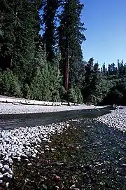 Slightly less than 20 miles (32 km) from the mouth, the river passes the southern boundary of Redwood National Park. It then receives Bridge Creek from the left, before winding through several groves of Sequoia sempervirens, more commonly known as redwood trees, from which the stream takes its name. Several of the tallest redwoods in the world are near the creeks banks. Near the small town of Orick it curves west, and receives Prairie Creek, its largest tributary, from the right. It empties into the Pacific Ocean about 30 miles (48 km) north of Eureka and 27 miles (43 km) south of Crescent City.[5]