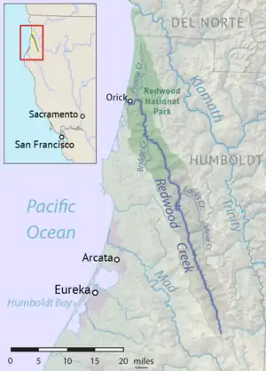 Redwood Creek (Yurok: 'O'rekw 'We-Roy [4]) is a 61.8-mile (99.5 km) river in Humboldt County, California. The river's headwaters are in the Coast Range at about 5,000 feet (1,500 m) and it flows roughly northwest until it empties into the Pacific Ocean near the small town of Orick, the only development in the 280-square-mile (730 km2)-watershed.