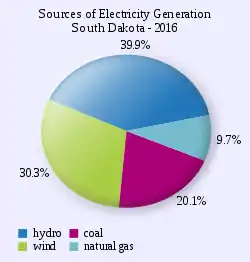 Four dams on the Missouri River generate the bulk of South Dakota's hydropower. Hydropower is the main source of electricity generation in South Dakota.[7] These dams are Gavins Point Dam near Yankton, the Fort Randall Dam near Pickstown, the Big Bend Dam near Fort Thompson, and the Oahe Dam near Pierre. They have generating capacities of 44 MW, 320 MW, 293 MW, and 786 MW.[8][9]