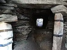 The earth house is located in a farmyard near the southeastern shore of the Bay o' Firth, on the Mainland of Orkney, in Scotland. Access to the underground monument is by ladder to a hatch in the roof.[1] The souterrain has an entrance passage which is 3.5 m (11 ft) long with a drop of around 0.7 m (2 ft 4 in) to the floor of the chamber. The chamber is hexagonal in shape and measures 3.3 m (11 ft), and is 2.5 m (8 ft 2 in) in width. The walls were built with a combination of slabs laid on edge and rough masonry. The 1.5 m (4 ft 11 in) corbelled roof is supported by four stone pillars.The walls are lined with five small alcoves.[2][3]