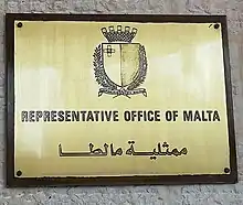 The Representative Office of the Republic of Malta in Ramallah, Palestine opened in June 2009 and is the embodiment of the traditional ties of friendship between Malta and Palestine. Apart from taking care of the enhancement of Malta - Palestine Relations[1] in the political and economic spheres. The Office also encourages support and cooperation between the Maltese and Palestinian people. The aim of the Representative Office of Malta in Palestine is also to monitor the constantly changing political situation and developments regarding the Israeli-Palestinian Peace Process. The Goal of the Peace Process is to achieve an independent, democratic and viable State of Palestine living side by side by the State of Israel.[2][3]