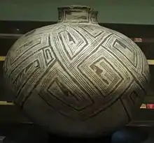 This Ancestral Pueblo pottery type was named for the Reserve area, where it was first found, and is a major subdivision of the Cibola Whiteware group. Common designs are opposed solid and hatched motifs that are interlocked with each other. Usually the hatching is diagonal, but parallel hatching in late examples occurs as well. Squiggle hatching may occur on some early examples. Usually the hatched motifs average two to four times as wide as the solid motifs but occasionally approach the same size. Framing and hatching lines are usually the same width. "Bulls eyes" are common in Reserve Black-on-White.[18]