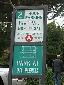 This parking sign in San Francisco stipulates that motorists may only park for up to two hours from 8 a.m. to 9 p.m. Monday through Saturday unless the applicable residential parking permit is displayed