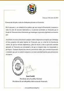 Guaidó communication to embassies in Venezuela: I am responsible for telling them that we are a sovereign nation and will continue to maintain diplomatic relations with all the countries of the world