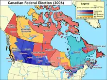 Map of the 2006 Canadian federal election results, showing Alberta as the main stronghold for the Conservative party, with significant support also coming from the interior regions of British Columbia, southern Saskatchewan, and Manitoba, as well as southern Ontario. Liberal support was greatest in urban areas, particularly in the Toronto area.
