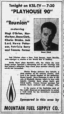 "Reunion" was an American television play broadcast live from CBS Television City in Hollywood on January 2, 1958, as part of the second season of the CBS television series Playhouse 90. Merle Miller wrote the teleplay based on his novel of the same name. Allan Reisner directed. Hugh O'Brian, Martha Hyer, Dane Clark, and Charles Drake starred.[1][2]
