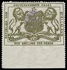 Stellaland's first revenues were issued in 1884 with the republic's coat of arms. Two years later a number of them were issued handstamped with a monogram JPM since a number of the original stamps had been stolen.[1]