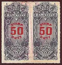 The Ministry of Finance of the Kingdom of Hawaii issued its first set of revenue stamps on December 22, 1876, when new taxes on deeds, agreements, bills of landing and other documents were introduced following the Stamp Duty Act of 1876. The first stamps to be issued were 25c and 50c values, with a $1 value being added in about March 1877, and $5, $10 and $50 values about March 1879. The stamps had numeral designs, with the dollar values being written as dala. The name of the country was expressed as HAWAIIAN ISLANDS, and the issue was rouletted.[2] The stamps were printed by the American Bank Note Company in New York City and were probably designed by Registrar J. O. Carter.[3]