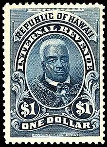 During the Republic of Hawaii, the previous issues remained in use, with reprints being made of the $1 stamp of 1876. In 1897, a new $1 value was issued with a new design depicting Hawaii's first king, Kamehameha I. This stamp was inscribed REPUBLIC OF HAWAII INTERNAL REVENUE, and it was issued to pay Customs duties. It was printed by the American Bank Note Company.[3]