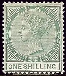 Tobago first issued revenues in 1879. A set of six values from 1d to £1 was issued, and in 1884 they were reprinted in a different watermark. A third set of six was issued in 1890 with the same values in new colours.[1] Some Tobago revenue stamps were also valid for postal use pending the delivery of stamps marked POSTAGE.[2] Tobago used Trinidad revenues from 1896 until joint issues appeared in 1908.