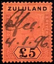 The British colony of Zululand issued revenue stamps in 1888. The only set consisted of seven values of 1d, 1s, 5s, 9s, £1 (two different colours), £5 and £20 of Natal revenues overprinted ZULULAND in a similar overprint to that used for postage stamps. The 1d later became valid for postal use as well. All the higher values now command high prices and are quite rare. In addition to this issue, the same Natal £5 is known with a different overprint in violet, but it is not known if this was a legitimate issue or not.