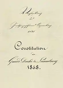 In 1841, William II authorised the first constitution of Luxembourg.[1] This document left all meaningful power in the hands of the sovereign. The legislature provided by the Constitution, the Assembly of Estates, was little more than a shadow parliament. It was elected indirectly, the ballots were not secret, and the vast majority of the population were excluded from political life by a system of census suffrage, requiring the payment of 10 florins per year in tax. At the elections of 1845, in the canton of Luxembourg, only 956 out of 28,477 inhabitants were eligible to vote.[2]: 22 The Assembly's sessions were held in private, and its assent was required only for penal and fiscal laws, the civil list, and the extraordinary budget. In 1841, this constitution was generally welcomed, but over the years, voices started to be raised in the Assembly of Estates, demanding a return to the civil liberties which had applied under the Belgian annexation of 1830-1839. Various other issues were a cause for discontent, such as the muzzling of the press, the ban on associations, the exorbitant expenses of the civil list, and lack of judicial and educational reforms.[1]: 31