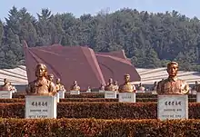 The entrance to the cemetery is marked by a monumental gate in Korean style. Each of the graves is provided with a bronze bust. At the far end of the memorial there is a conspicuous red flag made of granite.[2] Heo-nik Kwon & Byung-Ho Chung (2012) covered the cemetery in their publication North Korea: Beyond Charismatic Politics, noting the cemetery's significance in politics, where it can not only satisfy the North Korean need for revolutionary narratives, but also compensate for its flaw in large-scale absence of ordinary military cemeteries.[3]