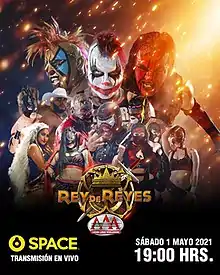 From 1997 to 2019, the Mexican Lucha Libre, or professional wrestling, company AAA has held a Rey de Reyes (Spanish for "King of Kings") show in the spring. The 1997 version was held in February,[2] while all subsequent Rey de Reyes shows were held in March. As part of their annual Rey de Reyes event AAA holds the eponymous Rey de Reyes tournament to determine that specific year's Rey.[3] Most years the show hosts both the qualifying round and the final match, but on occasion the qualifying matches have been held prior to the event as part of AAA's weekly television shows.[4] The traditional format consists of four preliminary rounds, each a Four-man elimination match with each of the four winners face off in the tournament finals, again under elimination rules.[2] There have been years where AAA has employed a different format to determine a winner.[4] The winner of the Rey de Reyes tournament is given a large ornamental sword to symbolize their victory, but is normally not guaranteed any other rewards for winning the tournament, although some years becoming the Rey de Reyes has earned the winner a match for the AAA Mega Championship. From 1999 through 2009 AAA also held an annual Reina de Reinas ("Queen of Queens") tournament, but later turned that into an actual championship that could be defended at any point during the year, abandoning the annual tournament concept.[5][6][7]