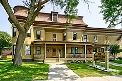 The Reynolds House is located south of downtown Barre, occupying a roughly triangular plot at the junction of South Main Street (Vermont Route 14) and Hill Street. It is a large 2+1⁄2-story wood-frame structure, with a mansard roof and shingled exterior. An ell extends from the main block, joining it to a period carriage barn. Prominent features include a round turret at the northwest corner, a single-story porch with turned balustrade across most of the main facade and ell, and a rounded projecting bay. The interior retains many original features, including chandeliers, builtin cabinets, and trim.[2]
