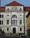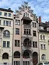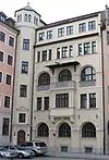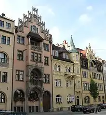 13 Apartment house 1905 Four-story neo-renaissance building with saddle roof, box bay window and plastic decor, by Fritz Seidlmair
