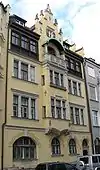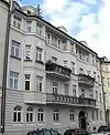 19 Residential house 1910-11 Four-story art nouveau style building with a rustic ground floor and a longitudinal balcony accessible by two bay windows, by Max Neumann, facade simplified