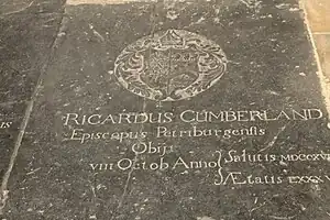 Richard Cumberland (15 July 1631 (or 1632[1]) – 9 October 1718) was an English philosopher, and Bishop of Peterborough from 1691. In 1672, he published his major work, De legibus naturae (On natural laws), propounding utilitarianism and opposing the egoistic ethics of Thomas Hobbes.