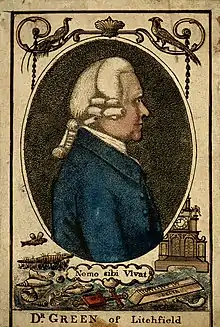 Greene was the first to establish a printing press at Lichfield, and from about 1748 until his death his zeal in collecting objects of interest never flagged. He deposited these curiosities in the ancient registry office of the bishops of that see, which stood nearly opposite the south door of the cathedral, and has long since been pulled down. A view of one side of the room of this museum, sent by the Rev. Henry White of Lichfield, appeared in the 'Gentleman's Magazine' for 1788, pt. ii. 847, and was reproduced in Stebbing Shaw's History of Staffordshire. The fame of his collections spread far and wide, and the building was open gratuitously on every day except Sundays. After a life entirely spent in the city of his birth he died there on 4 June 1793, aged 77. His first wife was named Dawson, and by her he had one daughter, who married William Wright of Lichfield. His second wife was Theodosia Webb of Croxall in Derbyshire, who died at Lichfield on 1 August 1793; she had one son, Thomas, a lieutenant and surgeon in the Stafford militia. Greene's portrait, with the motto, described by Boswell "truly characteristical of his disposition, Nemo sibi vivat", was engraved in his lifetime, and is inserted in Shaw's 'Staffordshire,' i. 308. A token still exists of him, and is described in 'Notes and Queries,' 1st ser. i. 167, 1850. On one side is represented his bust, with the words 'Richard Greene, collector of the Lichfield Museum, died 4 June 1793, aged 77;' on the other appears a Gothic window, lettered 'west porch of Lichfield Cathedral,' 1800.