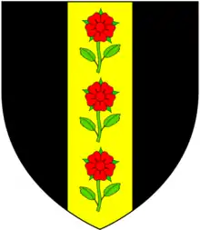 Canting arms of Rose of Wootton Fitzpaine in Dorset: Sable, on a pale or three roses gules slipt and leaved proper[1]