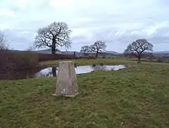 The River Weaver runs north–south through the west of the civil parish and the River Gowy runs east–west along part of its northern border. Both rivers are close to their sources in the Peckforton Hills, which rise to the north west of Ridley.[9] There is a low hill in the east of the civil parish, with a high point of 127 m at SJ567539, at the north part of Chesterton Wood. A mast and a covered reservoir are located on the top of the hill, and a trig point stands at SJ566542, around 100 metres north of the reservoir, at an elevation of 125 metres. The ground slopes gently downwards towards the Weaver in the west of the civil parish, with a low point of around 90 metres.[9]