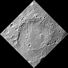 Sūr Dās crater (below center) and Riemenschneider crater (above center), from MESSENGER's first flyby in 2008