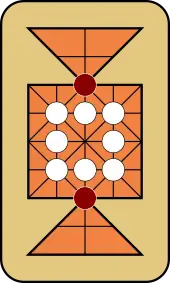 - Nine orang pieces are initially placed on the nine intersection points of the central square of the alquerque board, leaving 26 nodes unoccupied.