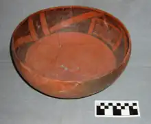 Pottery Mound Polychrome is considered a variant of San Clemente Glaze Polychrome, in the sense that the San Clemente slip scheme (different slip color on interiors and exteriors) is combined with the canon of red matte paint outlined in black glaze paint. In some of the most boldly executed examples of this type, however red matte paint designs are sometimes not framed in black. The background colors used in contrasting pairs include red (grading to orange), yellow (grading to olive), and white (probably using slip clay from the Acoma area, in imitation of Acoma-Zuni wares). Pottery Mound Polychrome dates from AD 1400 to 1490. The sole center of production was Pottery Mound, a village on the lower Rio Puerco (east).
