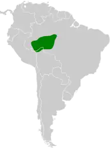 The nominate subspecies E. a. amazonica of the Rio Madeira stipplethroat is found in south-central Amazonian Brazil from the watershed of the Juruá River east to the Madeira River, in Peru's Department of Madre de Dios, and in far northern Bolivia's Pando Department.[12][13] Subspecies E. a. dentei is found in Brazil in the watershed of the Aripuanã and Machado rivers east of the Madeira. The area spans southern Amazonas, northwestern Mato Grosso, and northeastern Rondônia states. The species primarily inhabits lowland terra firme evergreen forest. In Bolivia it also occurs in more upland forest. In elevation it ranges only up to 400 m (1,300 ft).[12]