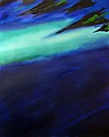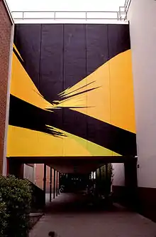 The couple left Los Angeles in 1969, alternating their time between New York and Toronto (which would continue until 1975)[16] when Toronto became her centre, the demand for her work increased. In New York, galleries were purchasing entire series’ of 100 prints outright.[9] One day in 1971 someone suggested she might obtain a better effect on her long lines/rays if she used an airbrush; hesitant at first, she began using it more, then eventually used it all of the time. She found that airbrush brought her something new, something that neither oil, nor acrylic, nor the millions of lines she had made in the 1970s had succeeded in bringing her.[9] The popularity of her work continued with many public and private commissions for large scale works and murals including one covering the top six stories of the Neill-Wycik college residence at Ryerson University in Toronto, the first of its kind in Canada. She was also commissioned to design a huge coloured skylight for the ceiling of Glencairn (TTC) subway station in Toronto entitled Joy; it was eventually removed at Letendre’s request because the panels had faded after being exposed to many years of sunlight.[17] However, "Joy" was reengineered and reinstalled in Glencarin Station in 2014 and cast a warm, orange glow over commuters to this day [18] In the early 1970s, she began to soften some of the edges in her works,[15] a trend that would continue the next few years; this resulted in a myriad of horizontal landscape compositions often containing a few or even only one thin hard edge line.