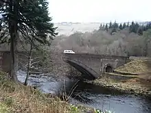 The level of Loch Garry has been raised by the construction of a dam at its eastern end, where the river formerly passed through a gorge.[7] The dam includes a Borland-type fish pass, which works in a similar way to a canal lock, enabling salmon to access Loch Garry.[8] Immediately downstream of the dam is a category C listed suspension footbridge, designed by the engineers Speirs and Company of Glasgow, and dating from the late 19th century.[9] White Bridge is a little further downstream, and as the river enters the village of Invergarry, the only substantial settlement along its course, it is joined by Aldernaig Burn, flowing southwards from Loch Lundie, and is crossed by a category B listed bowstring suspension footbridge with a wooden deck. It was erected in 1892, and carries a plaque that states: "Erected by Mrs Ellice of Glengarry and Glenquoich 1892".[10] The bridge is an early steel design which spans 197 feet (60 m), but by 2009 some of the main trusses were sufficiently corroded that it was closed for safety reasons. Repairs were made by the Forestry Commission, and the bridge reopened in 2011.[11] A more substantial bridge carries the A82 Inverness to Fort William road over the river. Its single arch was constructed of concrete in 1932, and it was probably designed by Mears and Carus-Wilson.[12] Prior to its construction and the re-alignment of the A82, the road crossed the river further downstream on a single span bridge dating from the early 19th century. This then only carried local traffic for the Glengarry Castle Hotel and nearby housing,[13] but the upstream face collapsed in 2020, and it has been closed to all traffic. Some 3.5 miles (5.6 km) from Loch Garry, the river enters Loch Oich, the surface level of which is 105 feet (32 m) AOD.[14]