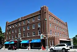 River Inn is a historic building located in Fergus Falls, Minnesota, United States. This was the third of three first-class hotels built in the central business district. Completed in 1929, it replaced the Hotel Kaddatz as the city's premier hotel.[2] It also assured that the Federal Courthouse, located across the street, did not relocate to Detroit Lakes in the 1920s. The River Inn provided accommodations for judges, jurors, lawyers, and court visitors. Boston architect Vernon A. Wright developed the hotel and designed the building. His father was George B. Wright, one of the city's founders. Vernon Wright also co-founded the Otter Tail Power Company. The four-story brick structure with Indiana limestone trim, features elements of the Medieval Revival style, the only commercial building downtown in that style.[2] It was built by the Lauritzen Construction Company. While owned by Wright until his death in 1938, the hotel was managed by the Roberts Hotel Chain of Winona, Minnesota. The building was extensively renovated after Al C. Kavli acquired the property in 1965, reducing the number of rooms from 96 to 15 and converting the rest into apartments. It was listed on the National Register of Historic Places in 1988.[1]