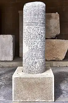 The history of road signaling in Greece dates back to Antiquity. The first road signaling included marble columns with the head of Hermes, protector of the wayfarers. Those signs were known as ἑρμαῖ ("Hermai").[2] There were also milestones for measuring street length in stadions.[3] Similar columns were also used in Roman times, but had miles as a unit of measurement.