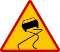 The Κ series of ΚΟΚ, includes warning signs. These signs have mostly a triangular shape (except for Κ-33 to Κ-37 and Κ-42α). Their borders are red (except for Κ-42α which is black) and their background is yellow (except for Κ-21 and Κ-42α which their white) with the pictograms being black. These signs are intended to alert drivers early on of risks (e.g. dangerous places, accesses of road junctions, access of railway level crossings, etc.) in order to take the appropriate measures in time (e.g. reduction of speed).