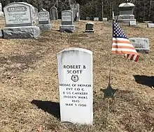 ![]() Headstone in Argyle NY's Prospect Hill Cemetery for Robert B. Scott who was honored with a U.S. Congressional Medal of Honor. | |