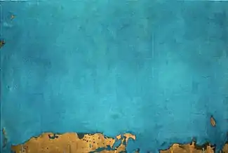 Bordo exhibited map paintings in six solo exhibitions between 1987 and 1996.[30][33][32][45] In these modestly scaled, quasi-minimal canvasses, he rendered the abstract shapes and irregular contours of landmasses from globes in glazes and textured fragments of color, which hovered between topographical suggestions of land, water or sky and abstraction, augmented by camouflage patterns, frames and elements from airmail envelopes, barely visible ledgers and stenciled aircraft forms (e.g., Exile, Letter).[12][46][32][45] Roberta Smith likened these works to "the infinite spaces" of Edward Ruscha and Vija Celmins and the fictional stamp paintings of Donald Evans.[12]