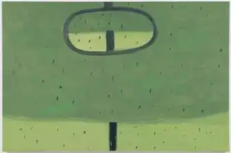 Bordo's paintings in the 2010s displayed a new sense of anxiety, reflecting issues such as the dramatic political polarization in the U.S. and climate change.[3][10][44][11] Artforum's Barry Schwabsky wrote that these paintings left behind the more delicate, lyrical touch of the landscape works, "evince[ing] a Gustonesque brusqueness and spleen… with a blunter, more robust facture and a more implacable presence."[9] This somewhat larger work was more explicitly structured by its imagery—often car windshields and rear-view mirrors, which served as metaphors for consciousness and movement in space and time, forward and backward (e.g., Rear-view, 2011; Wacko, 2012).[48][3][10][44]