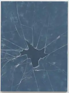 In 2019 at Bortolami, Bordo exhibited his "crackup" paintings, which drew upon prior series by employing monochrome grounds and lines incised into wet, oil surfaces that appeared like broken window panes. They depict dark holes on their surfaces, surrounded by spidery cracks that seemingly threaten to shatter further.[11][13] The show included nine canvases in moody greens and blues, ranging from imposing (seven feet tall) to intimate (twenty inches), that reflected a contemporary, contentious political climate.[13][11]