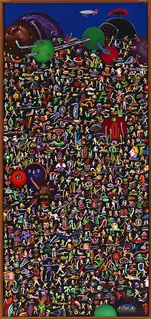 Upon return to Chicago, Donley's art changed again. He became interested in other images, "multiple images."[15] Color was still important, but there was no universal symbol, no motif. Instead, he took what he learned in California and shifted his focus mainly to the figurative image in a landscape.[3] In the 1970s, his work took on a "surrealist edge" where surrealism was combined "with an interest in historical, mythological, and literary themes, producing works painted in a naive style and peopled by tiny, caricatured figures."[5] This was most evident in the work he exhibited at Nancy Lurie's Gallery in Chicago. These were large paintings crammed full of tiny figures. Helen and her Suitors was one of these and was awarded the Mr. and Mrs. Frank G. Logan Prize in 1977.[16] Joshua Kind described these works as such:
