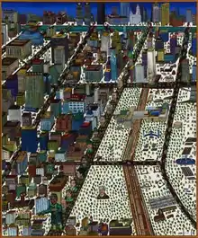 The city became a more important image in his work from 1982 onward and especially the city he knew most, Chicago. The city's "history, politics, sports, architecture, and diverse ethnic traditions"[20] all factored into his compositions. The Chicago Cubs appear in several paintings. Mayor Washington leads the St. Patrick's Day parade down Michigan Avenue in St. Patrick's Day (1983). Street of Big Dreams (1983) captures the grid street plan of the city along with some of its famous buildings.[20] New York was an important subject matter as well; Donley filled large canvases with the architecture of that city and portraits of New Yorkers: the street vendors, policemen, tourists, the Mets and the Yankees. These urban landscapes continued to evolve and change. The compositions took on more figures, both actual people from the cities and those from Donley's imagination. The figures also became larger, sometimes eclipsing the buildings.[21] There are still tiny figures on the streets, but these are often cartoonish and engaging in activities that are "positively bizarre."[22] Like the work in the 1970s, they are still crammed with images, "buildings, cars, and people,"[22] but the focus is the city. In the late 1990s, Donley was still working with images of the city. As James Yood wrote in Artforum, "Donley has chosen a grand, challenging, and unwieldy theme for his work... no less than the life of the modern city, as manifested in its buildings and in its residents."[23] But by this point, Chicago and New York were not his only subject matter. He also painted Las Vegas, Los Angeles, San Francisco, and most recently, Portland, Oregon. As Donley said in a 1990 article, he has "always been fascinated by the energy of the city in both its growth and decay."[6]